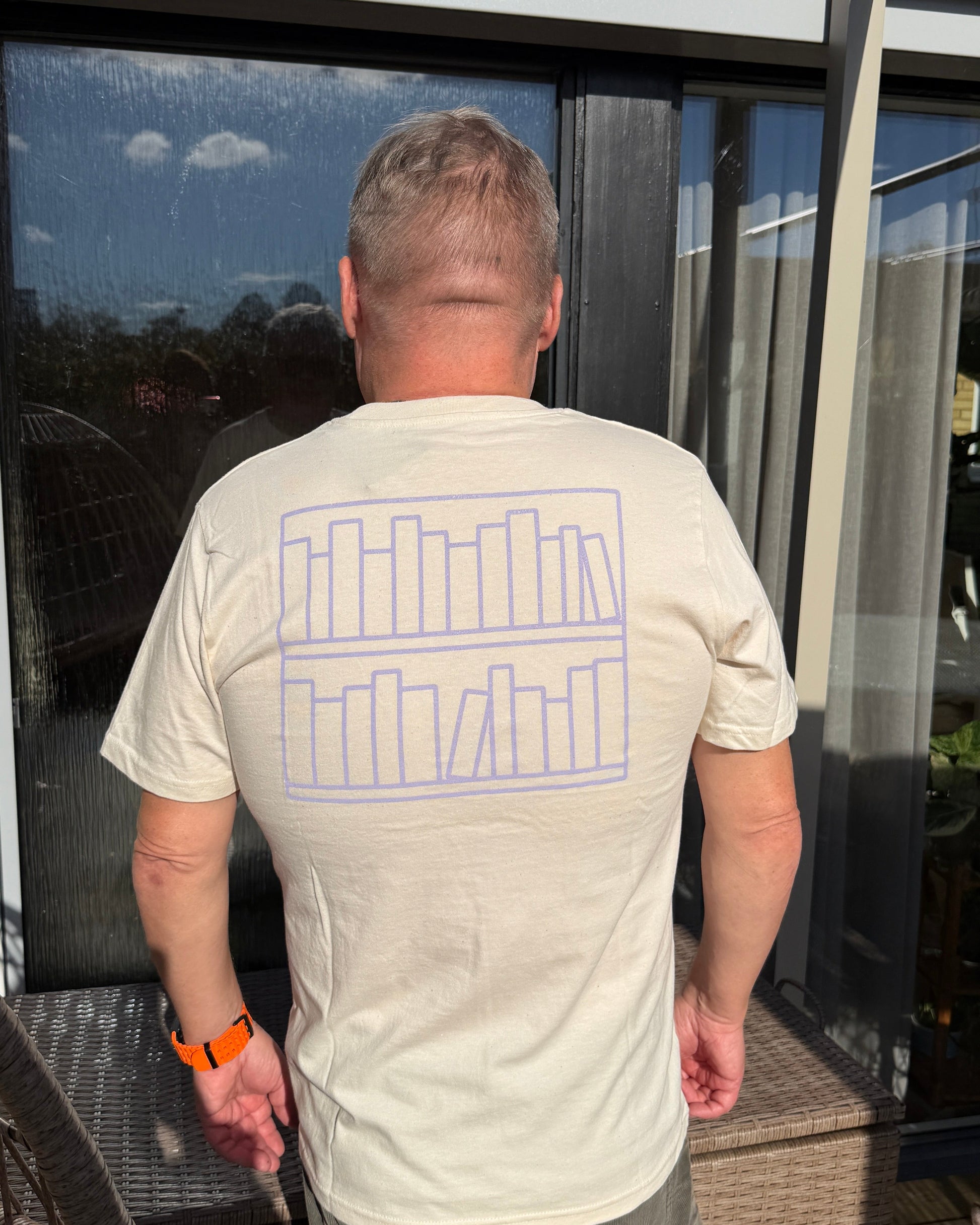 Beige t-shirt i 100% bomull tillverkad av 30 % återvunnet och 70 % ekologiskt material (180 G/M²). Med trycket Bookworm och bokhylla. Tidlös unisex t-shirt. Den har rund hals, korta ärmar och 1x1 ribb för en bekväm passform.