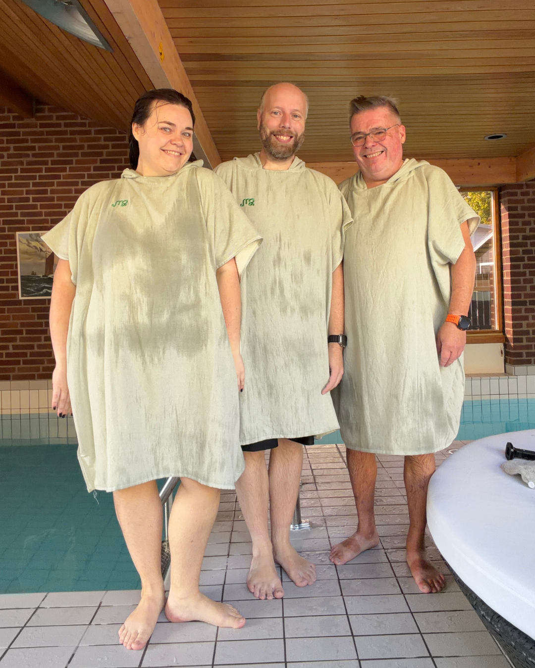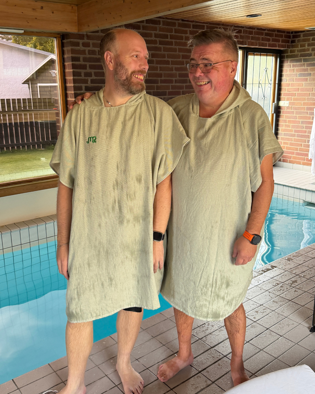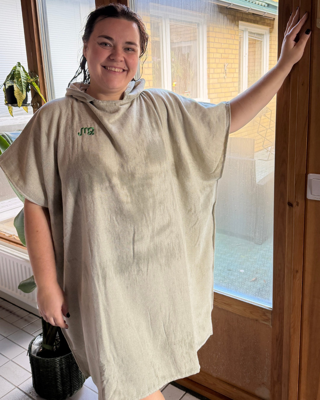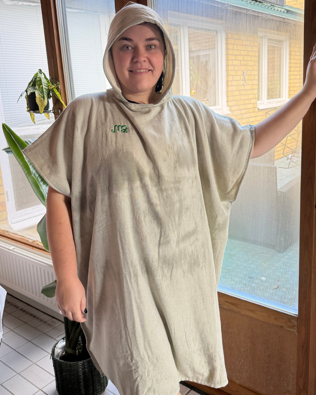 En praktisk hamam-poncho i mjuk bomullsblandning. Utsidan är slät medan insidan i frotté ger härlig komfort och effektiv absorbering. Ponchon är snabbtorkande, lätt att bära och perfekt för strand, pool eller hemma. Den gröna brodyren är monogrammet MG. FINNS I BEGRÄNSAT ANTAL JUST NU!