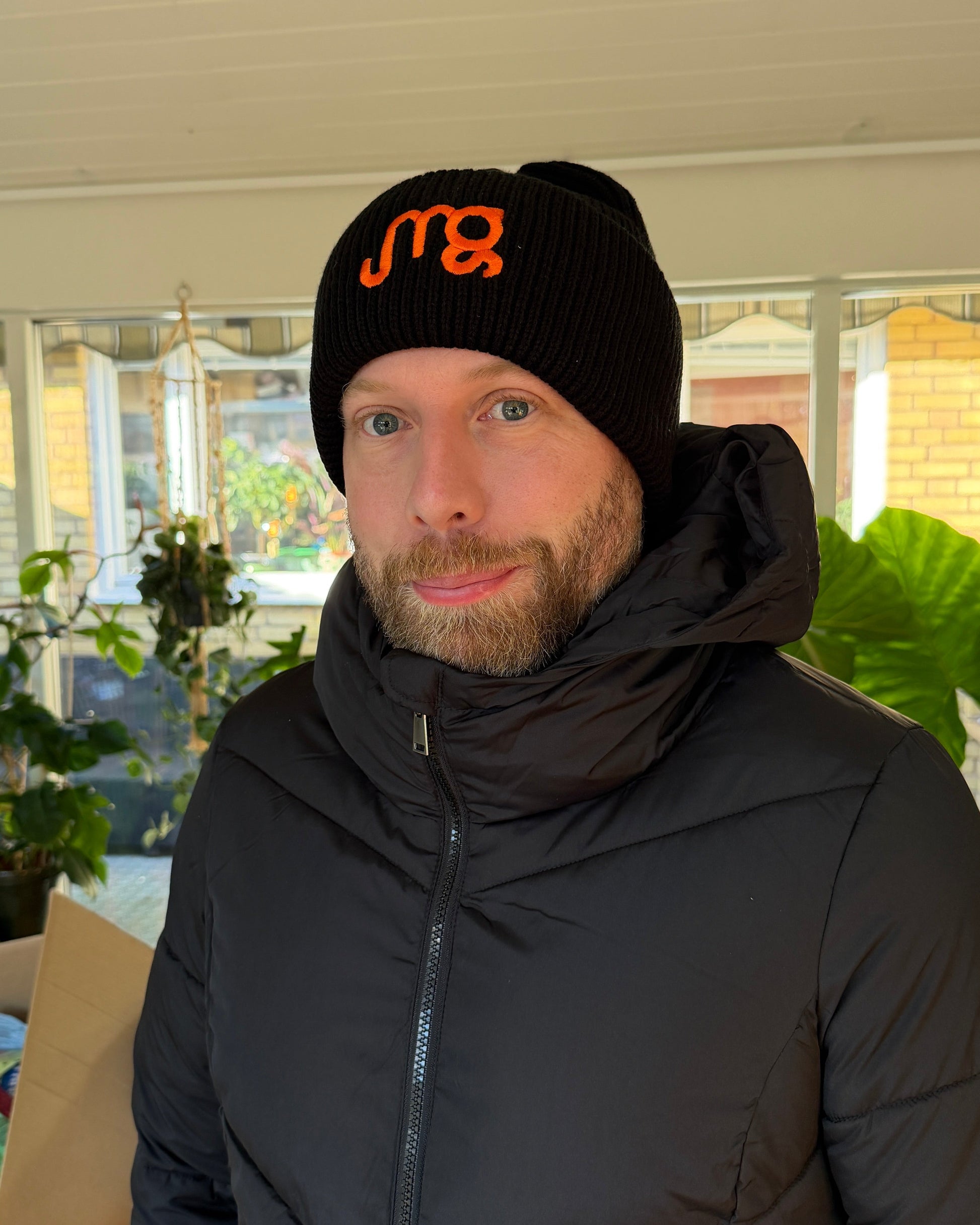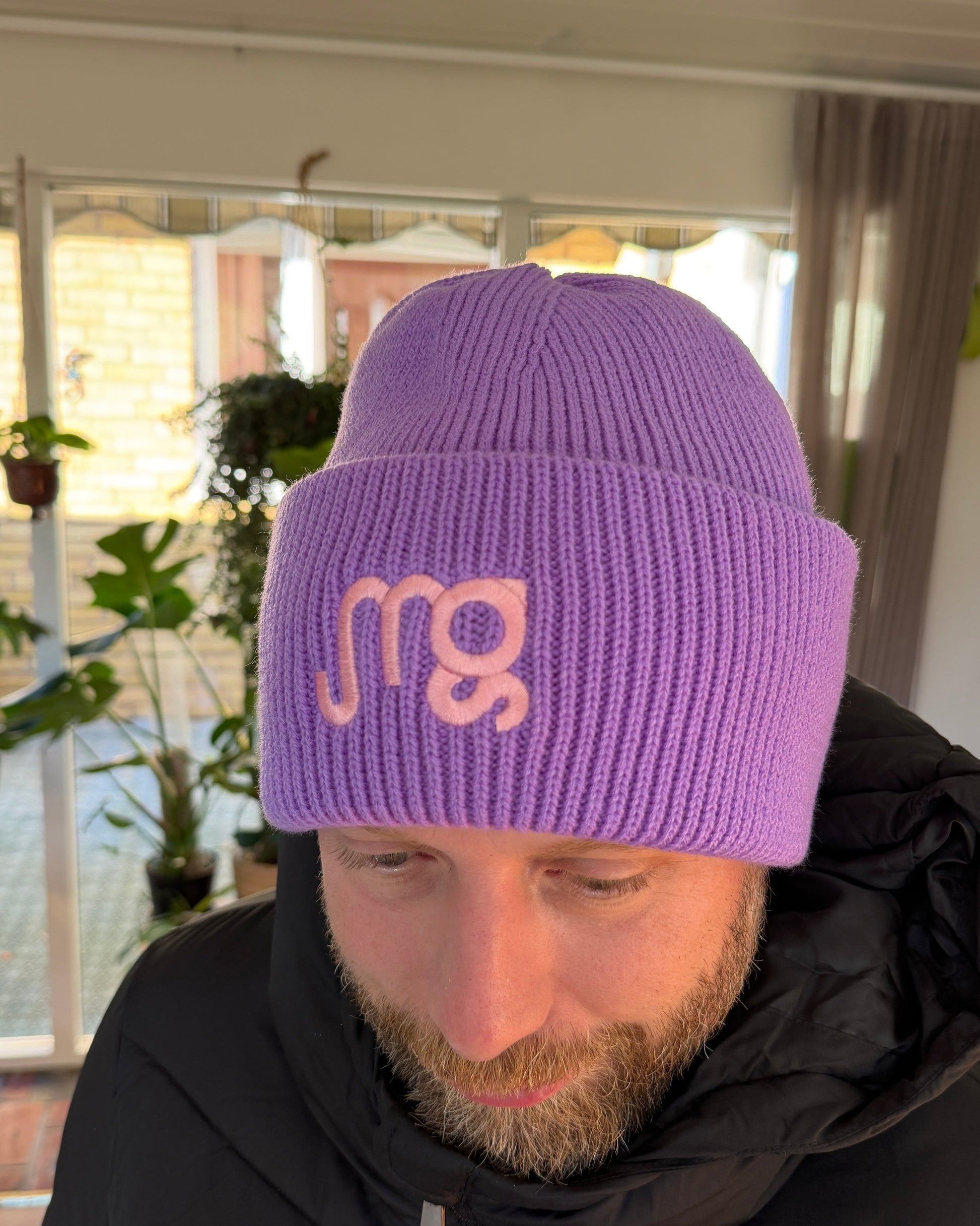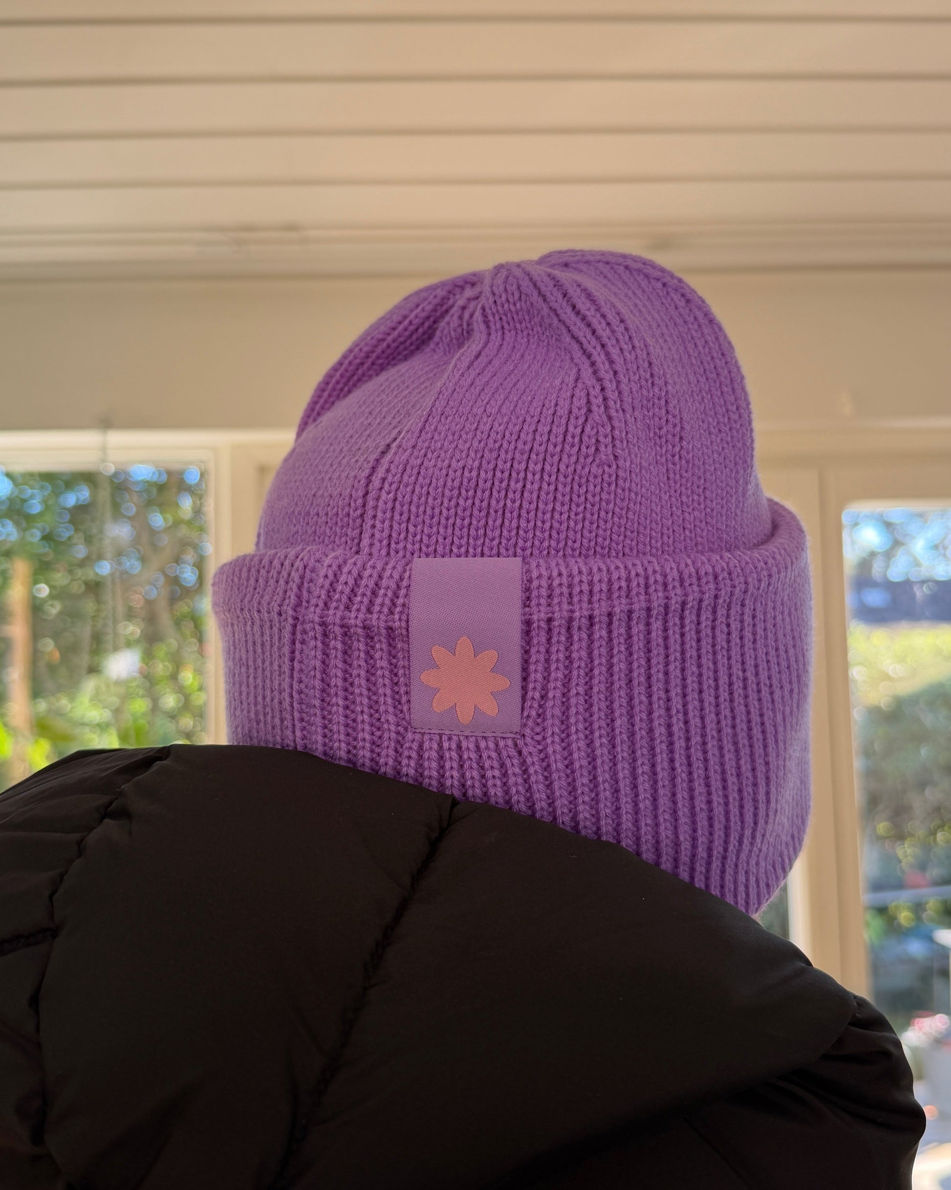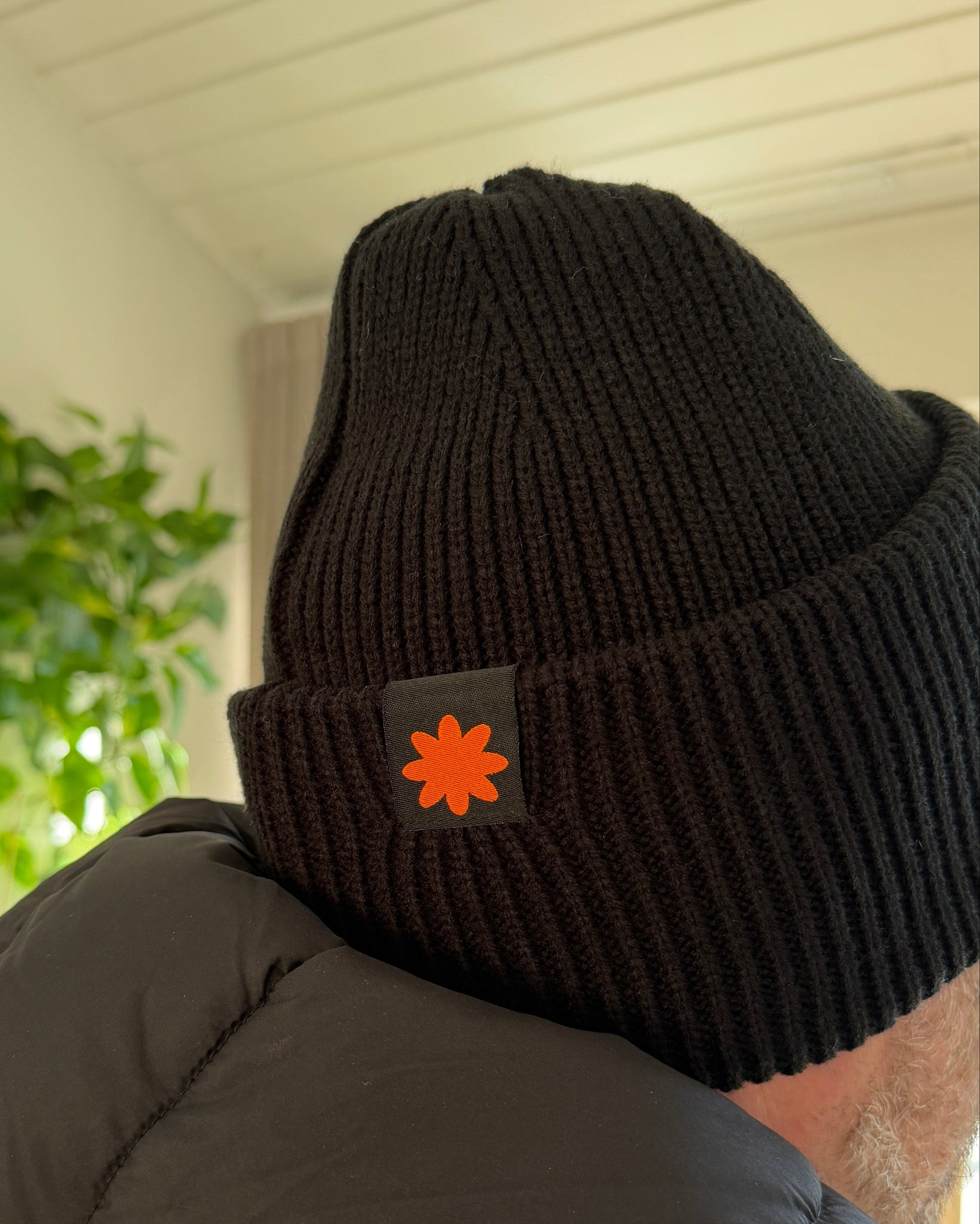 Kraftig, enkelstickad mössa i akryl med smala ribbor. Högt uppvik i dubbelt lager och 4 dekorativa sömmar i toppen. Mått: B25xH23 cm, uppvik: 11cm.